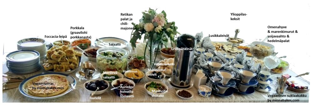 Tässä yleiskuva vegaanisesta ylioppilasjuhlamenusta 31.8.2019. Ryhdyn pikkuhiljaa erittelemään sitä resepteiksi. Laittakaa minulle viestiä, jos jokin resepti erityisesti kiinnostaa ja tarvitsette sitä pikaisesti. Kakut ostimme tällä kertaa Jyväskyläläisestä Minna Bakes Juhlapalvelusta (kävivät erittäin hyvin kaupaksi). Merileväsalaattia löysimme pakasteena Asian Food -kaupasta (Seppälän K-Citymarket).