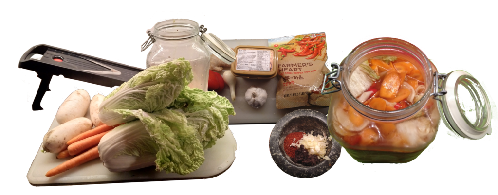 Korealainen hapankaali eli kimchi on varsinaista superruokaa. Sen pääasialliset raaka-aineet ovat kiinankaali ja retikka (retiisin isoveli), mutta mikään ei estä kokeilemasta muita vihanneksia. Värikkäitten kasvisten (paprika, porkkana, violetti kiinankaali) lisääminen on suositeltavaa, sillä happamuus vaalentaa vihreää väriä. Kimchi maustetaan yleensä voimakkaasti chilirouheella (gochugaru), inkiväärillä, sipuleilla ja valkosipulilla. Gochugaru on verrattain lempeän makuista, joten sitä saa annostella reippaasti. Jos korvaat sen muulla chilivalmisteella, ole varovainen annostelun kanssa. Resepteissä voi olla myös merilevää ja kalakastiketta. Hapattaminen on perinteinen ja turvallinen säilöntämuoto. Tärkeää on käyttää puhtaita raaka-aineita ja astioita sekä annostella suolaa riittävästi. Lopullisessa tuotteessa suolaa on 20-30 g/L. Maitohappokäymisen saavat aikaan kasvisten pinnalla ja sisällä olevat bakteerit, joten raaka-aineita ei saa kuumentaa. Omassa reseptissäni keitän ja jäähdytän ensin suolaliemen (50 g suolaa 1.5 litrassa vettä), jossa marinoin kasviksia 1 vuorokauden. Tämän jälkeen kaadan suolaliemen pois (otan sen talteen), hieron mausteseoksen vihannesten sekaan, ja palautan suurimman osan suolaliemestä takaisin astiaan niin, että perunanuijalla painellut kasvikset jäävät nestepinnan alle. Niiden päälle kannattaa voit laittaa muovikelmun tai pakastepussin sekä painoksi vielä suolavedellä täytetty astia. Kimchi saa fermentoitua (käydä) huoneenlämmössä n. 4 vrk, minkä jälkeen se laitetaan jääkaappiin. Kimchin maku voimistuu ja kasviksen pehmenevät lisää, kun maltat säilyttää sitä jaakaapissa muutaman päivän. Käymisen alkuvaiheessa bakteerit kuluttavat hapen ympäristöstä. Pian maitohappobakteerit (etenkin leukonostokit) jyräävät alleen muut mikrobit tuottamalla säilymistä edistävää maitohappoa ja hiilidioksidi-kaasua. Käymisessä pitää pyrkiä pitämään olosuhteet hapettomina, siksi astian pinnalla pitäisi olla nestekerros. Itse käytän patenttikorkilla varustettua lasipurkkia käymisastiana. Pidän sitä suurimman osan aikaa suljettuna, ja päästän ylimääräisen hiilidioksikaasun aika ajoin pois. Raaka-aineissa on vähän fermentoituvaa sokeria, joten purkin räjähtämisen vaara on melko pieni. Kimchi säilyy erittäin hyvin jääkaapissa. Jotkin homeet käyttävät ravinnokseen maitohappoa, joten kannattaa pitää huoli siitä, että astian pinnalla pysyy nestekerros.