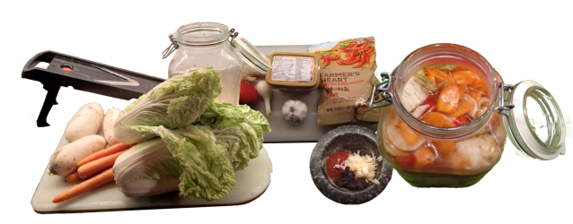 Korean sauerkraut kimchi is real super-food. The main ingredients are napa cabbage (Chinese cabbage) and radish (Kor. mu, Jap. daikon). Practically almost any vegetable can me amended to the recipe. Kimchi is seasoned with ground chili pepper “gochugaru”, ginger, onions and garlic. The recipes may also contain seaweed or fish sauce. Gochugaru has a relatively mild taste. If you use other types of red pepper (fresh or ground), be careful with dosing. Do realize however that kimchi should taste spicy and fresh, as it is used as a side dish. It is essential to use clean vessels and raw materials and to use enough salt. The salt content in the final product should be 20 to 30 g per litre. The organisms responsible for lactic acid fermentation grow on the surface or inside of the vegatables. Therefore it is important not to heat them. I dissolve salt into boiling water (50 g per 1.5 L water) and let it cool overnight. Then I add the vegetables and macerate them one day in the salt water. I pour the water off and save it for further use. The vegetables are packed in layers to the fermentation (preservation) jar with the spice slurry. After re-filling, I return most of the salt water to the jar and use a wooden club to compress the contents and to drive out excess air. Take care that all the ingredients will be covered by liquid. Put a piece of plastics and something heavy (e.g. drinking glass filled with salt water) on the top. Ferment kimchi 4 days at room temperature, then place the jar into fridge.
