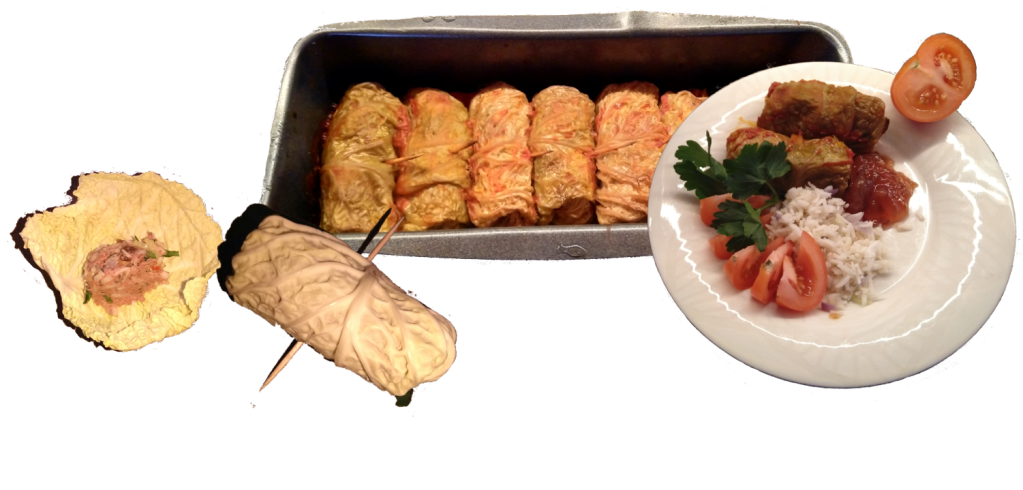 Tämä resepti kunnioittaa alkuperäistä bulgarialaista esikuvaansa (zelevi sarmi). Balkanilla kaalinlehdet riivitään kokonaisista kaalinpäistä, jotka on säilötty maitohappokäymisellä – ne ovat siis eräänlaista hapankaalta, ja kääryleissä on siksi miellyttävä hapan perusmaku, jota korostetaan tomaattipohjaisella haudutuskastikkeella. Niissä perusmausteena käytetään kynteliä, jota voi olla hankala löytää kaupasta. Suomalaisissa kaalikääryleissä kaalikääre tehdään yleensä keräkaalin lehdistä, jotka irroitetaan keitetystä tai höyrytetystä kaalista. Siksi niiden tekeminen on hieman vaivalloista. Päädyin käyttämään kurttukaalia (savoijinkaali), jonka lehdet ovat valmiiksi riittävän ohkaisia ja pehmeitä. Nyt, kun tarjolla on monenmoisia kasvispohjaisia jauhelihajäljitelmiä, kokeilin Lidlin tuotetta ”Next Level Vegejauhis”, mielestäni ihan onnistuneesti.