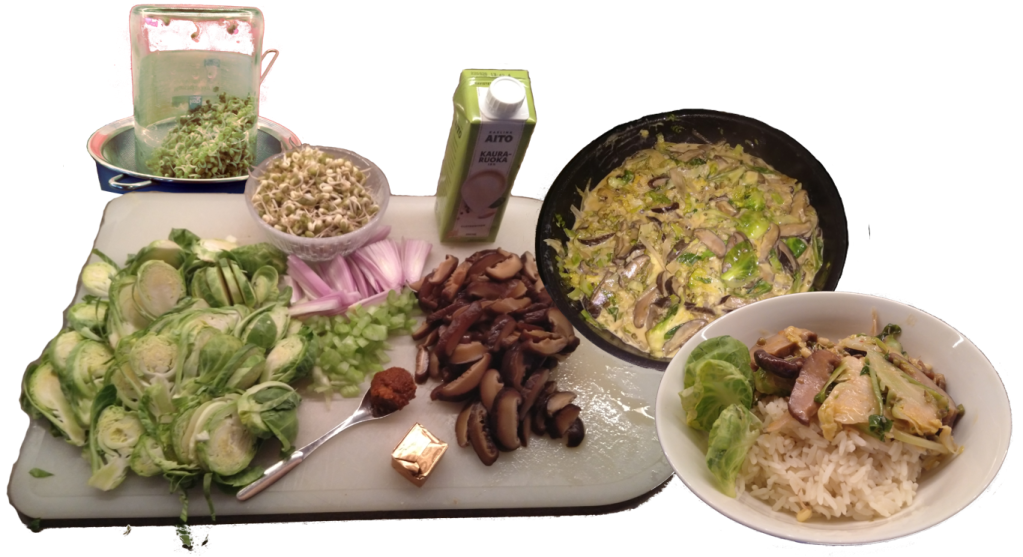 Tähän ohjeeseen käyvät mitkä tahansa sienet, mutta suosittelen siitakesienen käyttöä. Siitake tarjoaa hyvin ”lihaisen” makuelämyksen, etenkin käytettäessä kuivattuja ja liotettuja sieniä. Kun tähän yhdistää mung-pavun itujen miedosti pähkinäisen aromin sekä tuoreiden ruusukaalien rouskuvan raikkaan suutuntuman, ei tarvita muuta kuin kaurakerman samettista pehmeyttä täydentämään makujen sinfonia. Maustoin tämän kokonaisuuden teelusikallisella harissa-maustetta (currytahna käy yhtä hyvin) sekä aromisuolalla.