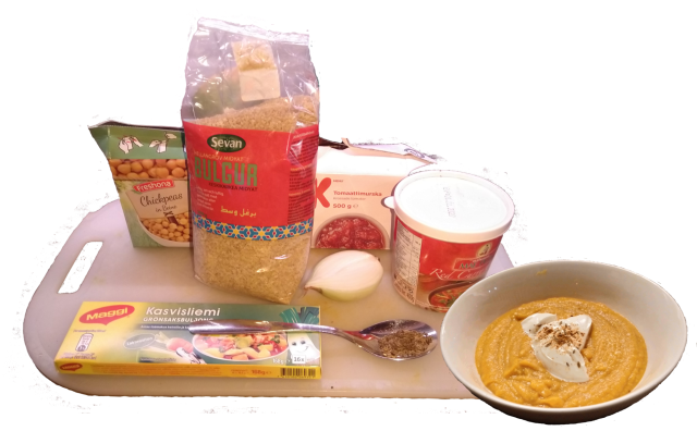 - Add tomato crush, bulgur (or semolina or rice), chick peas (or similar), ground cumin and vegetable broth cube.